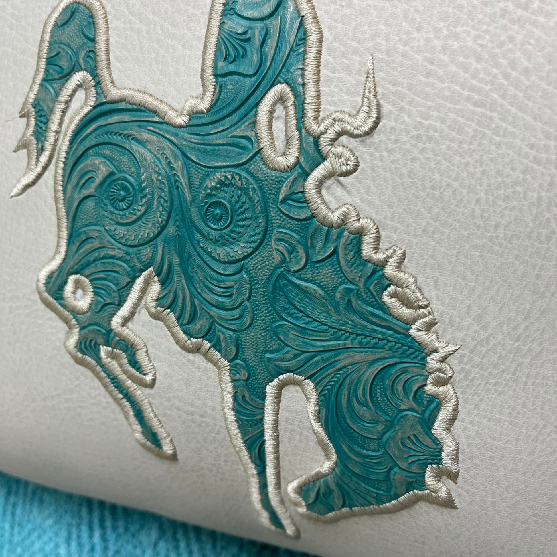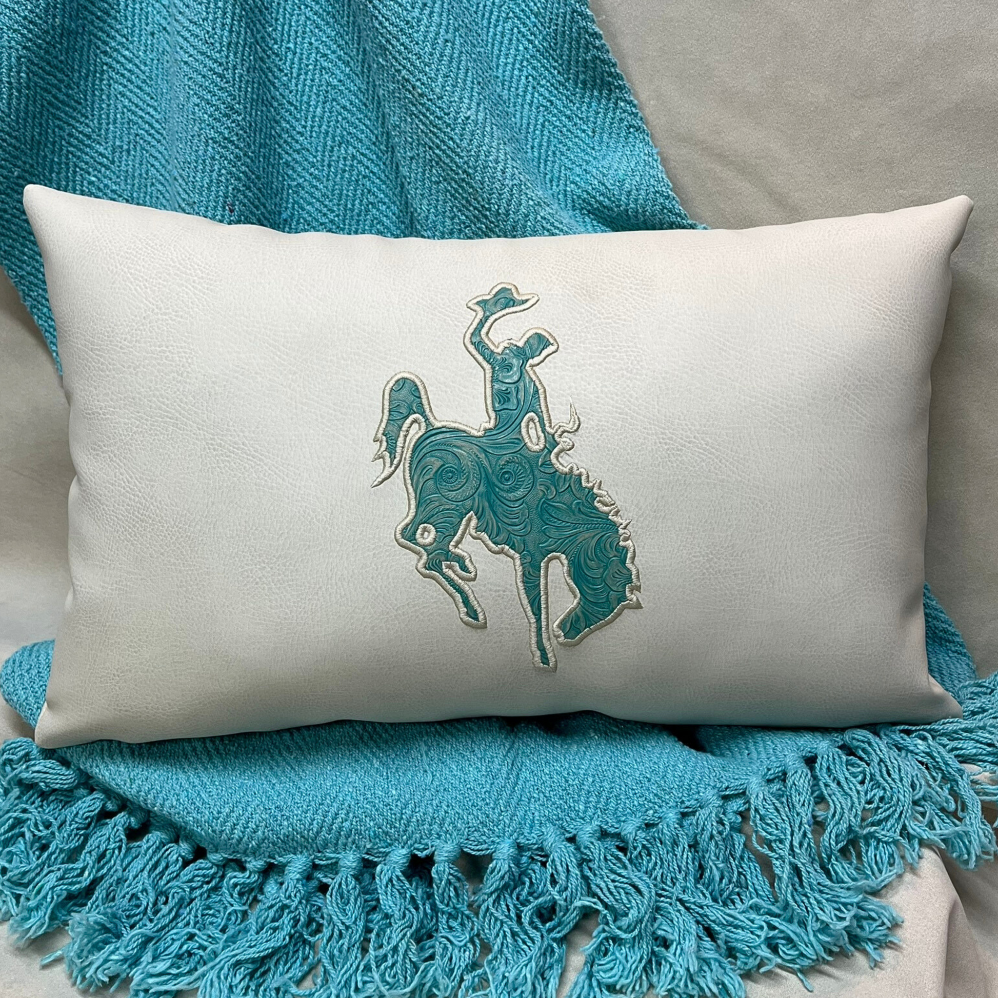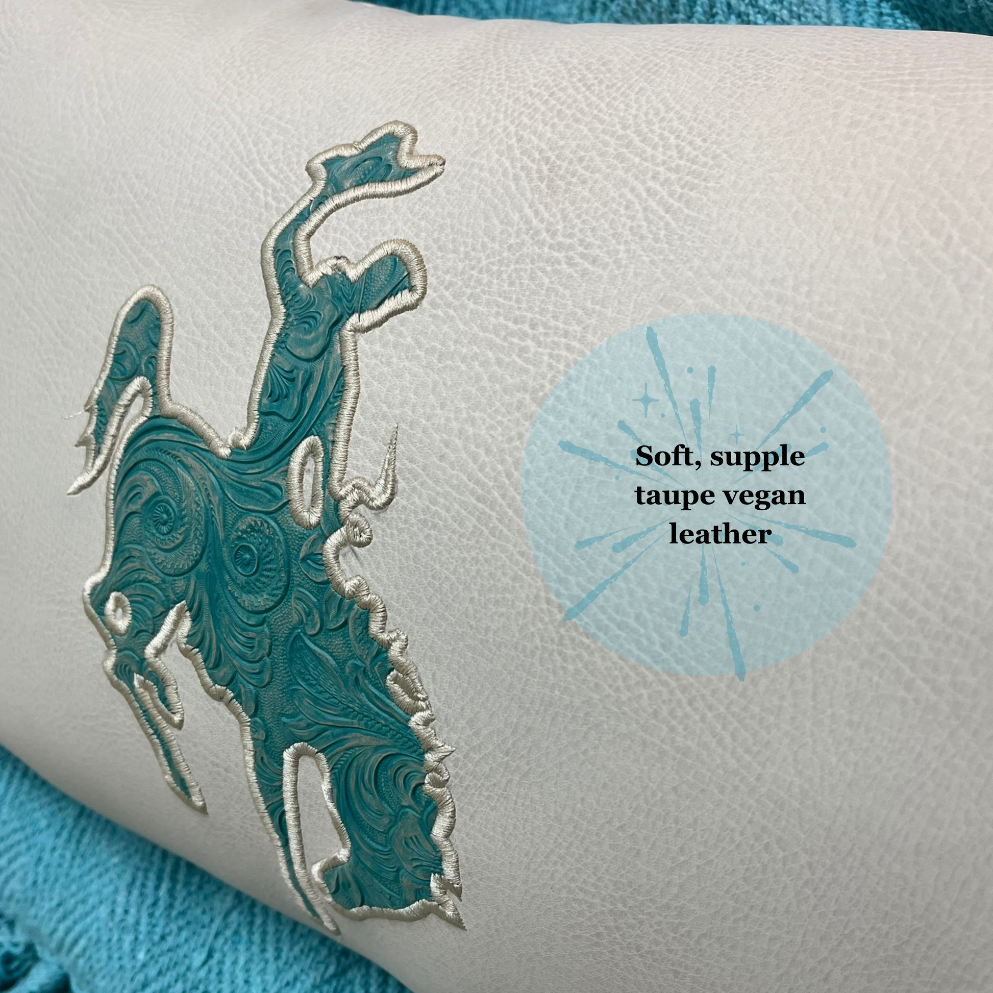 Designed for those who love rustic charm with a coastal twist, this unique throw pillow features a vibrant turquoise embroidery of a bronco and cowboy on a soft off white vegan leather front. It’s the perfect accent piece for ranch homes, cowgirl bedrooms, or modern farmhouse interiors looking to add that coastal cowboy flair.