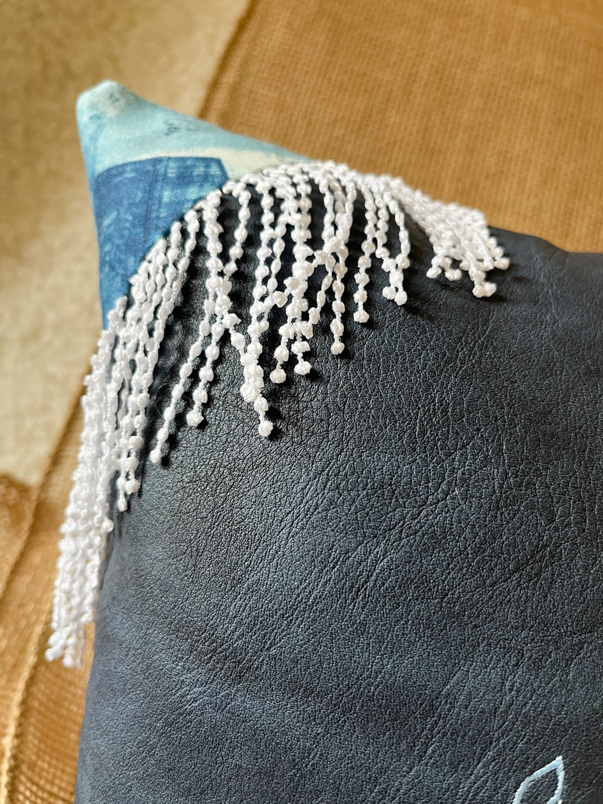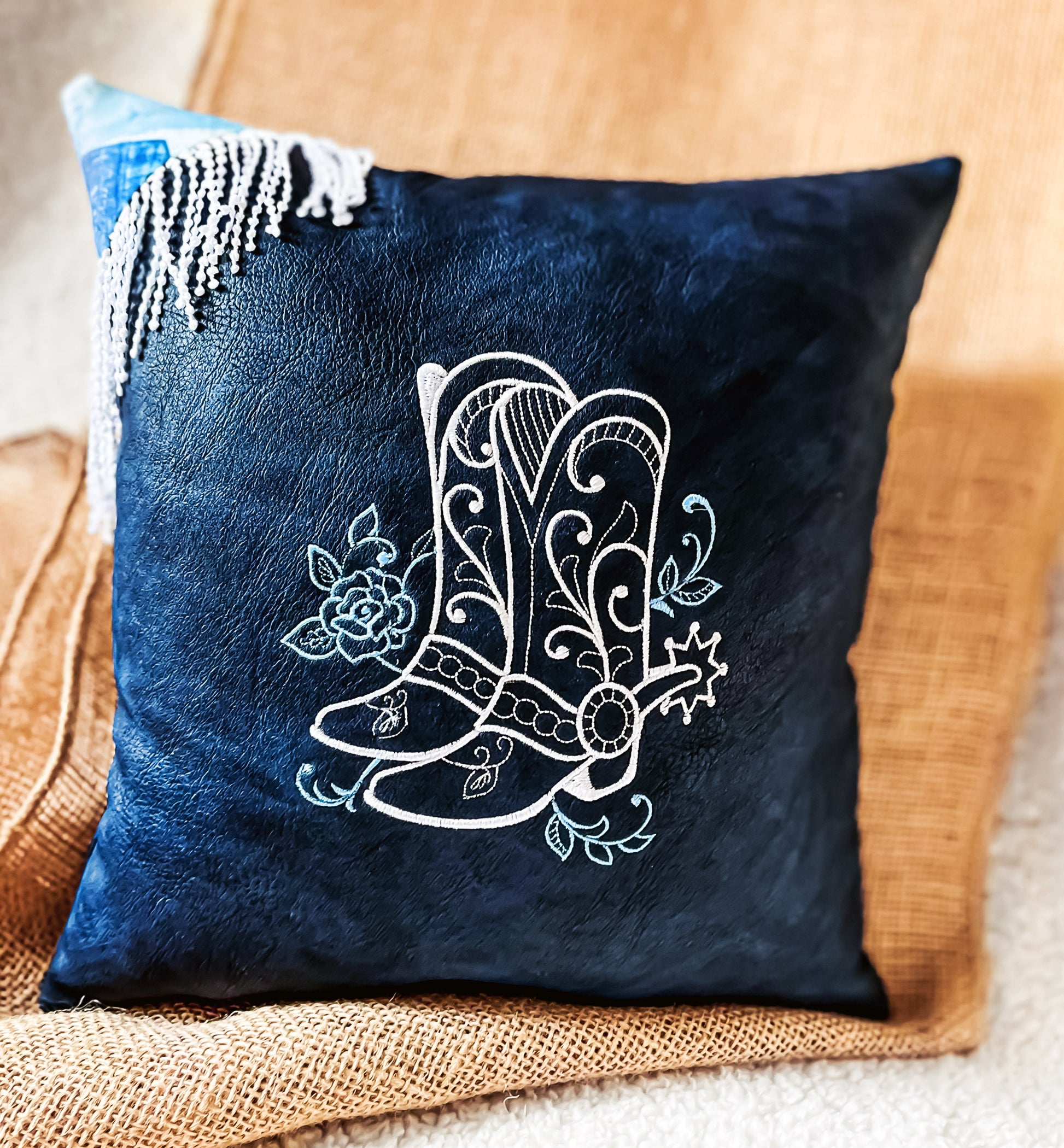 Add a touch of whimsy and western charm to any space with our jewel toned vegan leather pillow. This soft blue pillow is crafted from high-quality vegan leather and features a delightful embroidered design of cowgirl boots adorned with subtle flowers. A unique corner embellishment of denim and white fringe adds an extra layer of texture and flair, making it a standout piece.