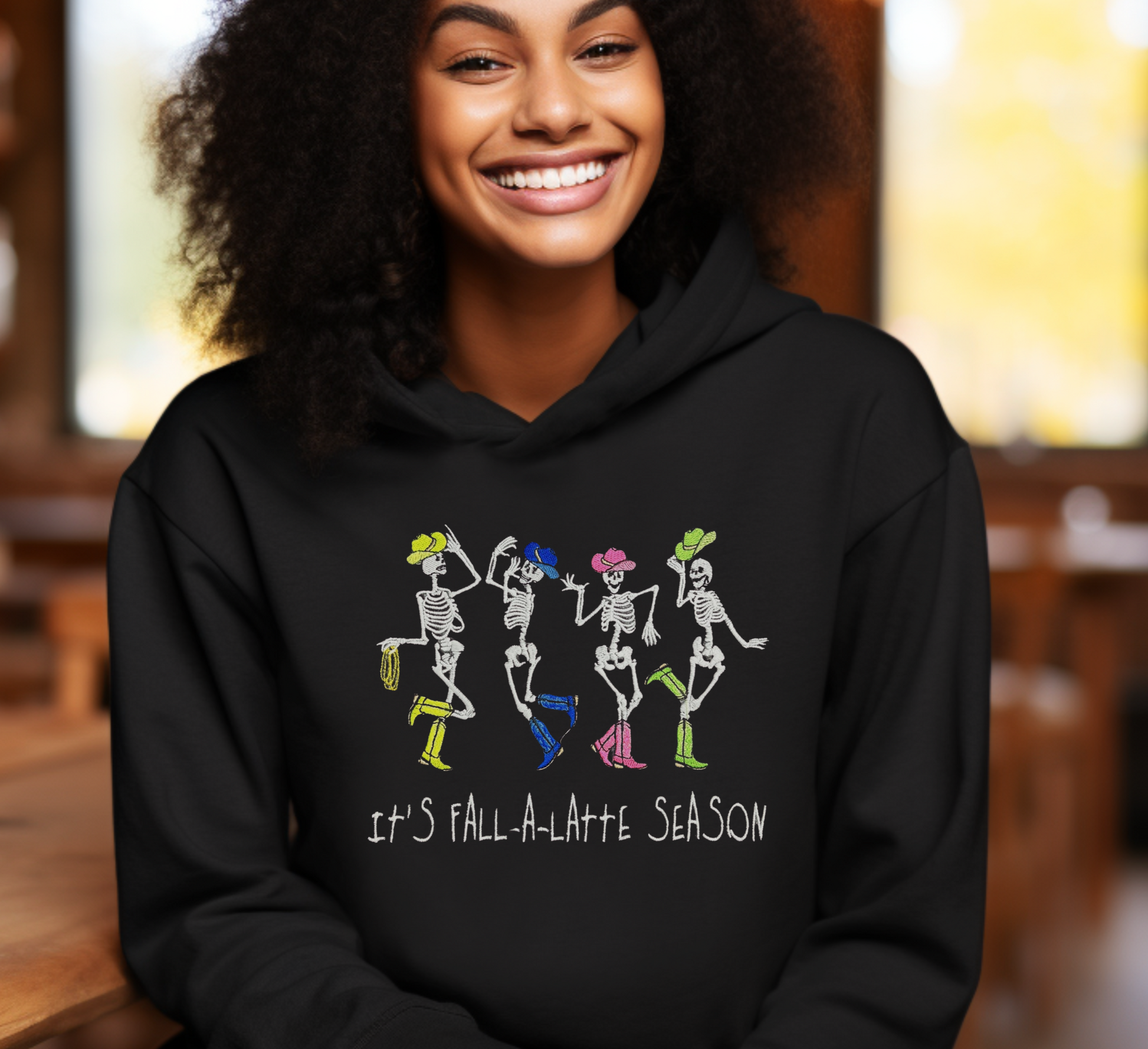 Glow-in-the-Dark Funny Skeleton Fall Hoodie – “It’s Fall-A-Latte Season” | Western Cowgirl Boots Sweatshirt